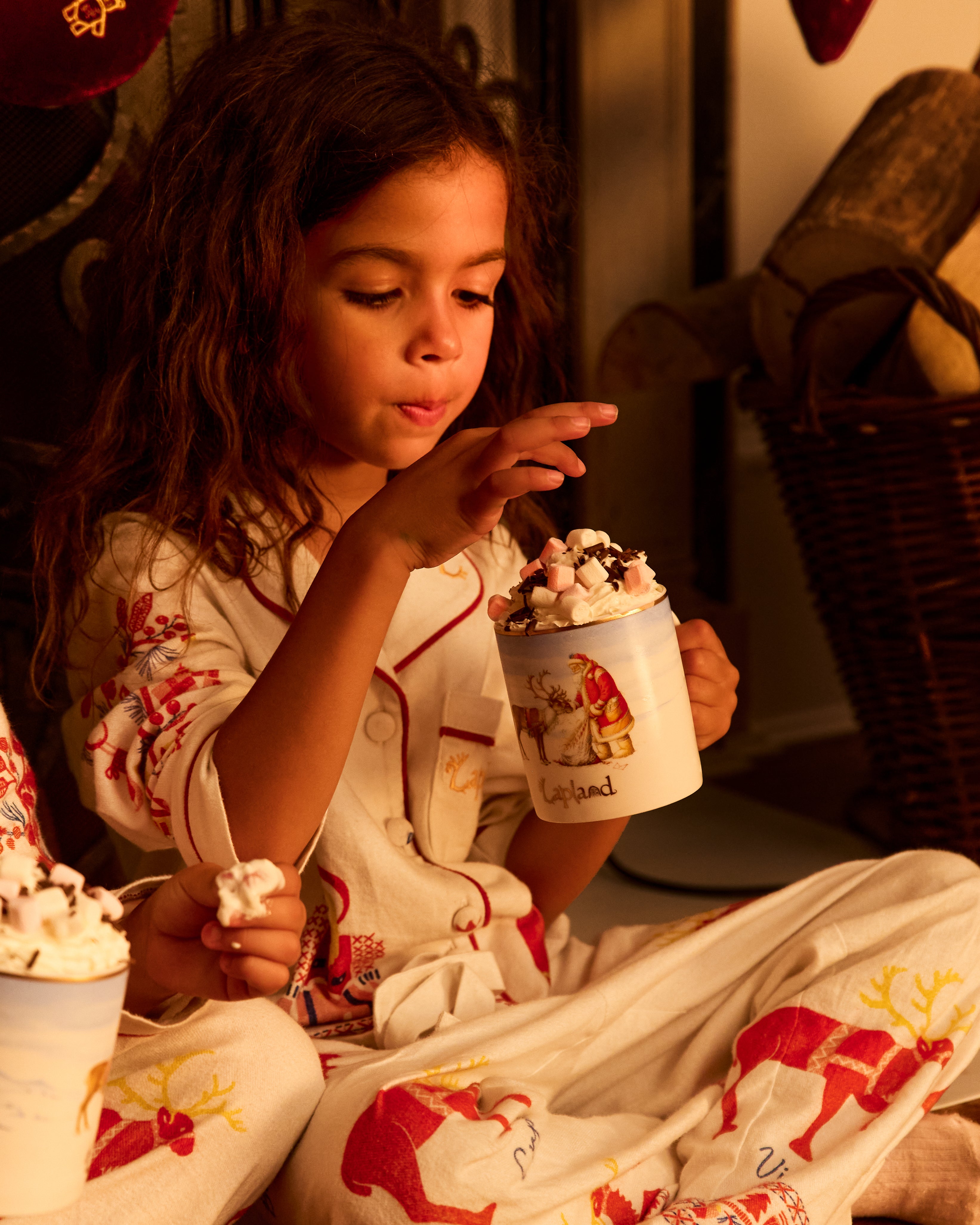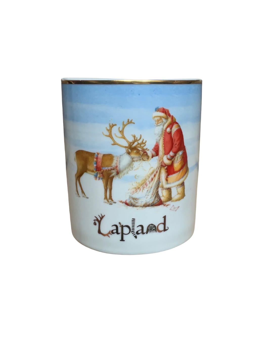 The Elves’ treasured mugs, reserved for sipping Lapland Hot Chocolate on Christmas Eve. Each one with a charming illustration of Father Christmas and one of his reindeer. Height 9cm x Diameter 8.5cm.